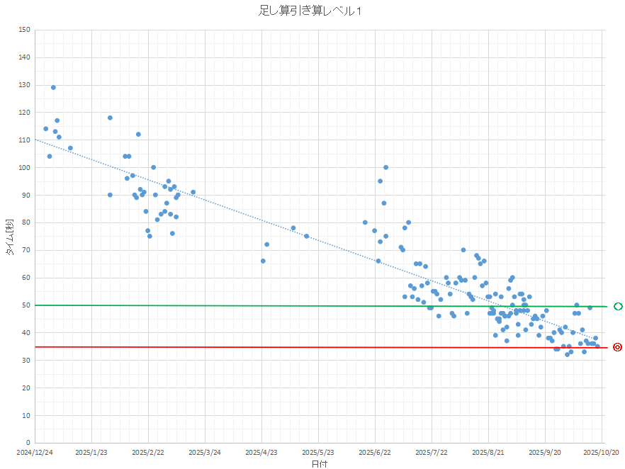 足し算は35秒、引き算は30秒が限界に近いタイムとのことですので、ひとまず以下まで計算力が付いたことは確認できました